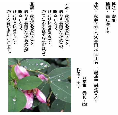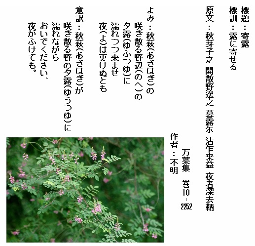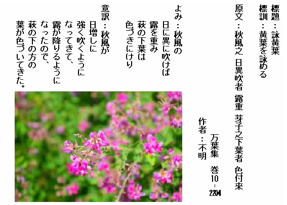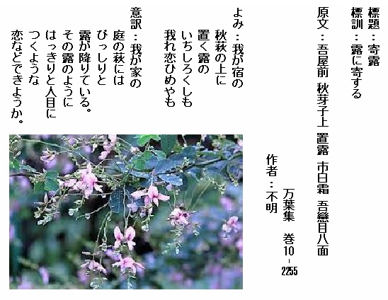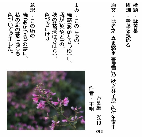 巻10-2213:このころの暁露に我が宿の秋の萩原色づきにけり