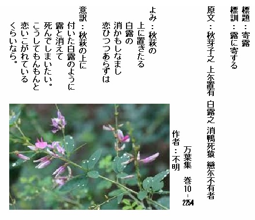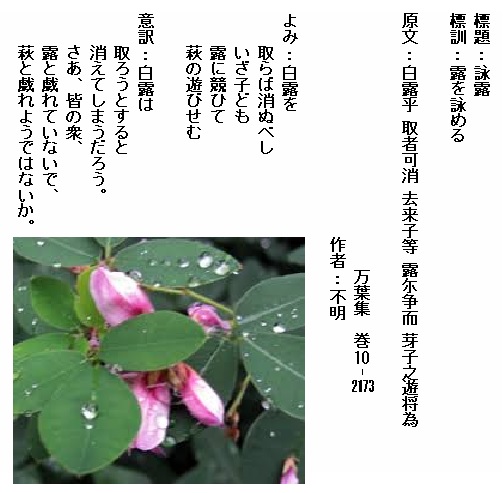 巻10-2173:白露を取らば消ぬべしいざ子ども露に競ひて萩の遊びせむ