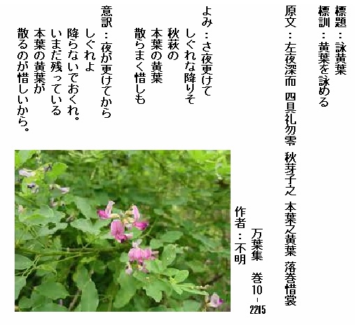 巻10-2215:さ夜更けてしぐれな降りそ秋萩の本葉の黄葉散らまく惜しも