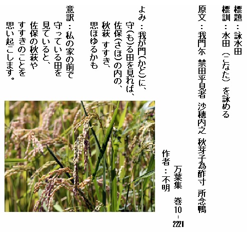 巻10-2221:我が門に守る田を見れば佐保の内の秋萩すすき思ほゆるかも