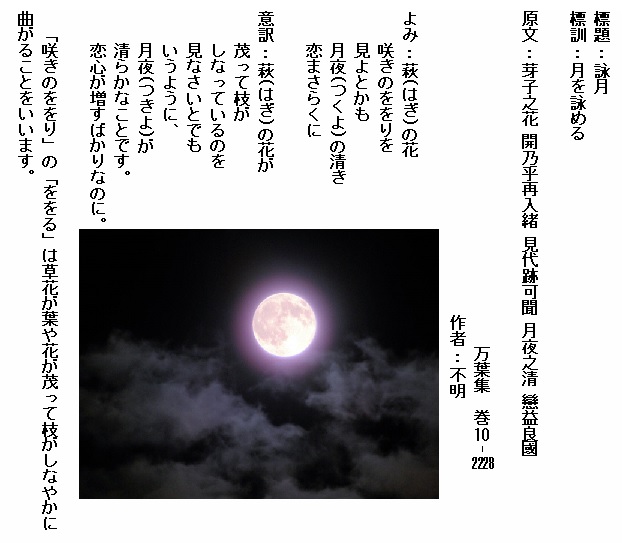 巻10-2225:我が背子がかざしの萩に置く露をさやかに見よと月は照るらし