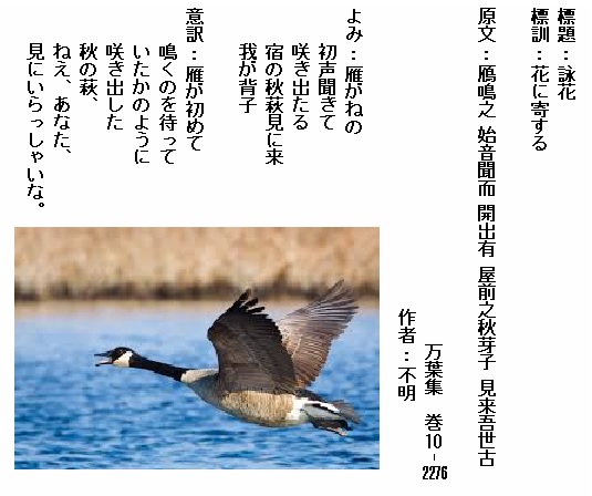 巻10-2276:雁がねの初声聞きて咲き出たる宿の秋萩見に来我が背子