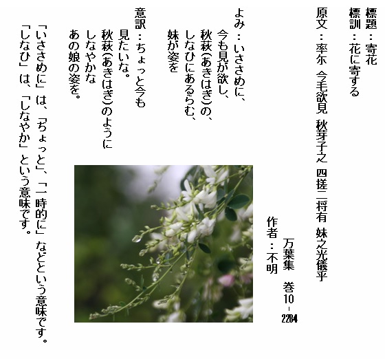 巻10-2284:いささめに今も見が欲し秋萩のしなひにあるらむ妹が姿を