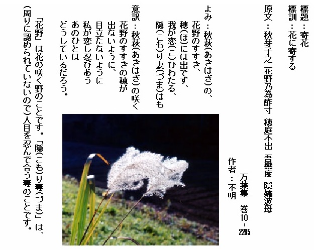 巻10-2285:秋萩の花野のすすき穂には出でず我が恋ひわたる隠り妻はも