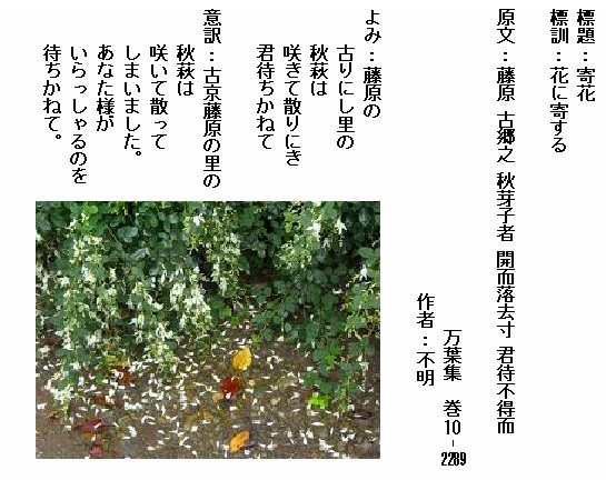 巻10-2289:藤原の古りにし里の秋萩は咲きて散りにき君待ちかねて