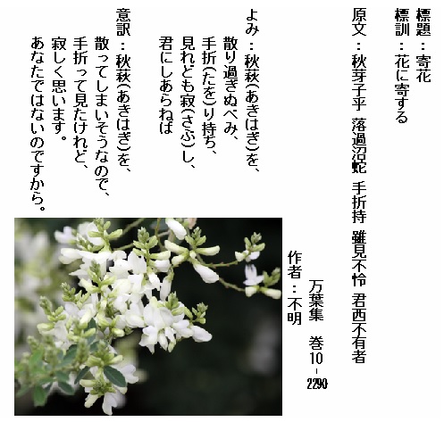 巻10-2290:秋萩を散り過ぎぬべみ手折り持ち見れども寂し君にしあらねば