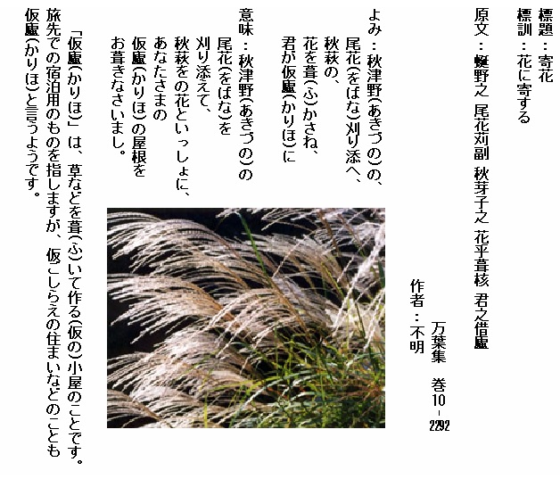 巻10-2292:秋津野の尾花刈り添へ秋萩の花を葺かさね君が仮廬に