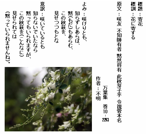巻10-2293:咲けりとも知らずしあらば黙もあらむこの秋萩を見せつつもとな