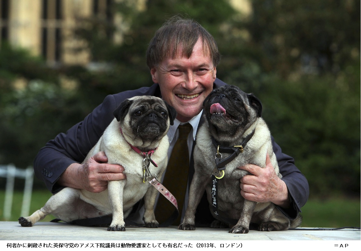 英下院与党議員、選挙区で刺され死亡 テロと断定 ―― 英与党・保守党のデービッド・アメス下院議員(69)が15日、英南東部のエセックス州にある自身の選挙区内の教会で男に刺され死亡した。警察当局は殺人の容疑で25歳の男を逮捕、テロ事件と断定した。初期の捜査で、男はイスラム過激派と関連する動機があったと発表した。