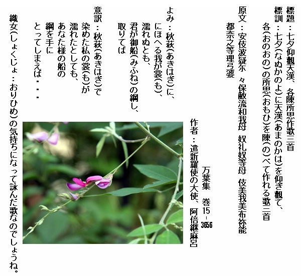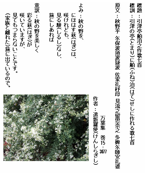 巻15-3677:秋の野をにほはす萩は咲けれども見る験なし旅にしあれば