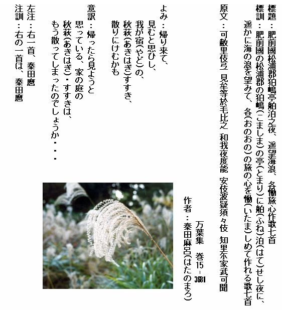 15-3681:帰り来て見むと思ひし我が宿の秋萩すすき散りにけむかも
