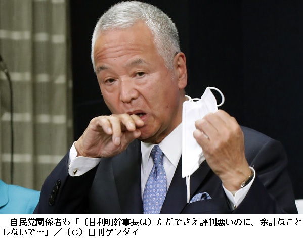 「このまま甘利さんがテレビに出演していると100票、200票と票が減っていく。困ったことに、本人には国民に嫌われている自覚がなく、しかも人前で政策を披歴したがっている。よほどナルシシストなのでしょう。自分のツイッターで“イケメン自慢”までしているありさまです。やっぱり幹事長は“選挙の顔”になる人にすべきだった。でも、人気者の小泉、石破、河野の“小石河連合”は、冷や飯を食わされている。せめて、甘利さんは余計なことをしないで欲しい」