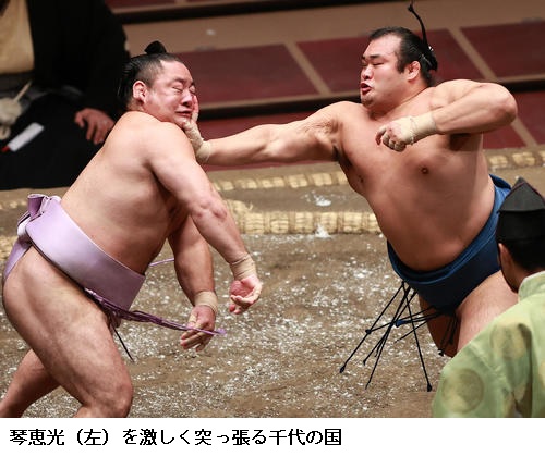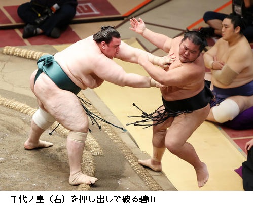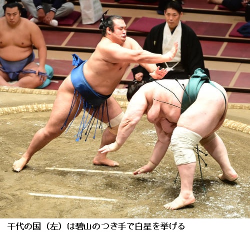 ▽千代の国に碧山は碧山につき手があって千代の国が勝ちました。