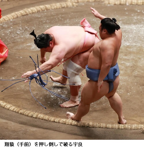 ▼翔猿に宇良は宇良が押し倒しで勝ちました。