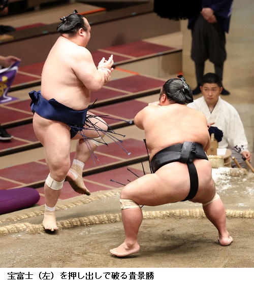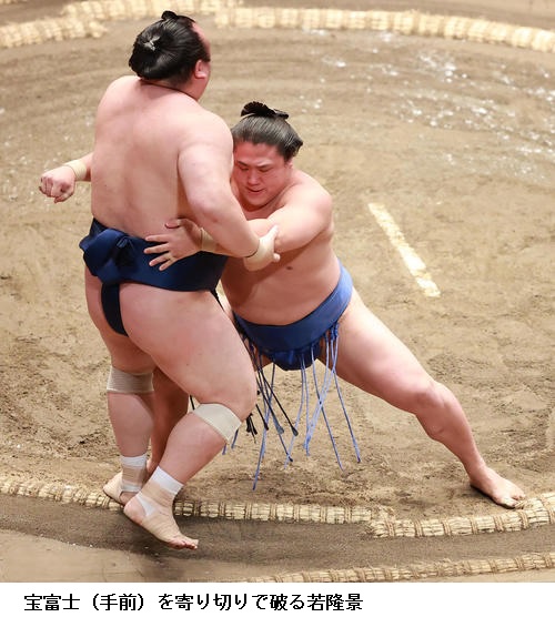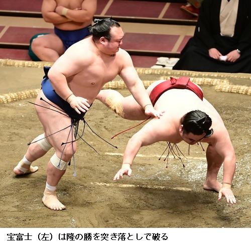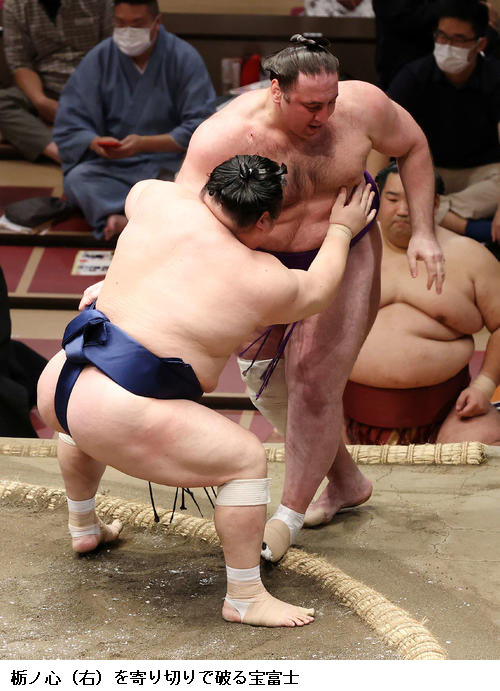 ▽栃ノ心に宝富士は宝富士が寄り切りで勝ち越し。栃ノ心は負け越しです。
