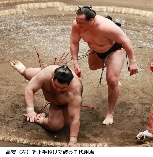 ▼千代翔馬に高安は千代翔馬が上手投げで今場所初白星です。