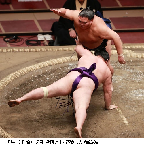 ▼新関脇 明生に関脇 御嶽海は御嶽海が引き落とし。
