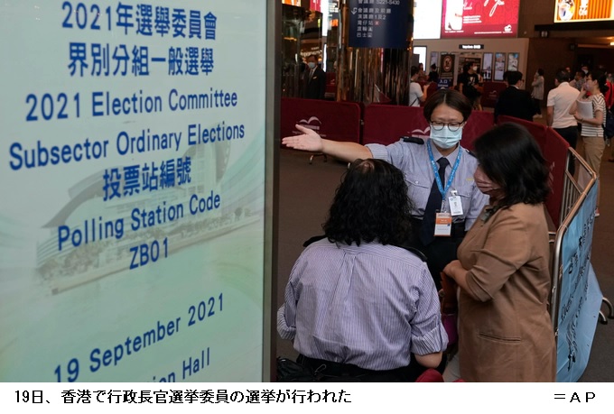 香港選挙「愛国者」主導に 親中派一色、民主派排除 ―― 香港で行政長官を決める選挙委員(定数1500)の選挙が19日実施された。中国は3月に「愛国者による香港統治」を掲げ選挙制度を大幅に見直した。候補者から民主派を排除し登録有権者は前回より97%減った。定数の7割超が無投票で決まる異質の「選挙」となった。