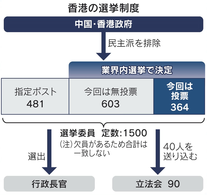 従来の選挙委員は民主派が3割程度を占めていた。ふだんは中国寄りの経済界が民主派と組めば、数のうえで親中派を上回る可能性があった。中国は経済界の政治力をそぐため、不動産業界などの選出枠を減らした。かつて選挙委員だった李嘉誠氏や李兆基氏ら著名経済人は今回、参加を見送った。