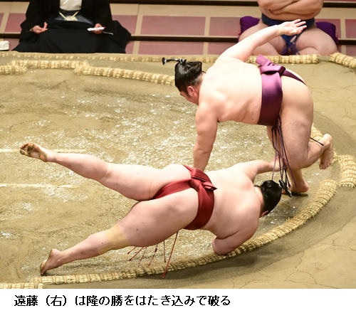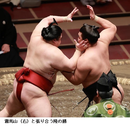 ☆隆の勝「なるべく(霧馬山にまわしを)取らせないようにしたが、組んでしまった。慌てずに距離を取れた」