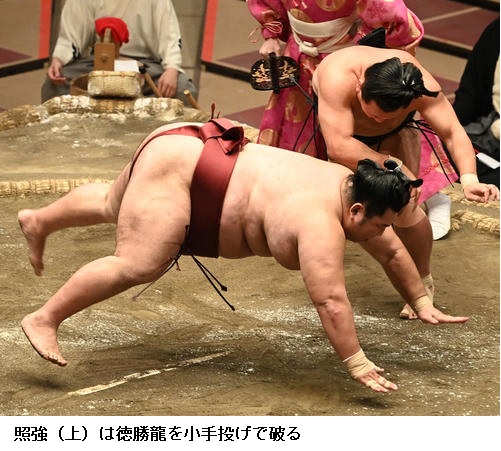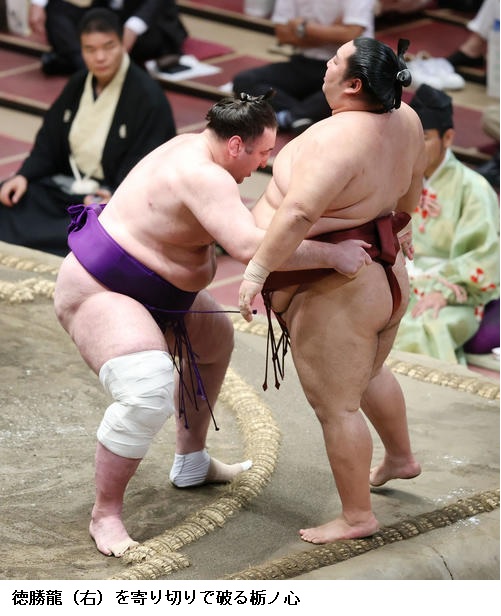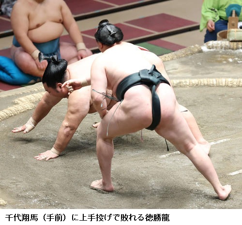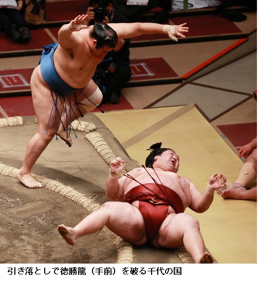 ▽千代の国に徳勝龍は千代の国が引き落としで7勝目。