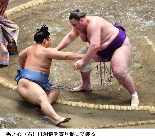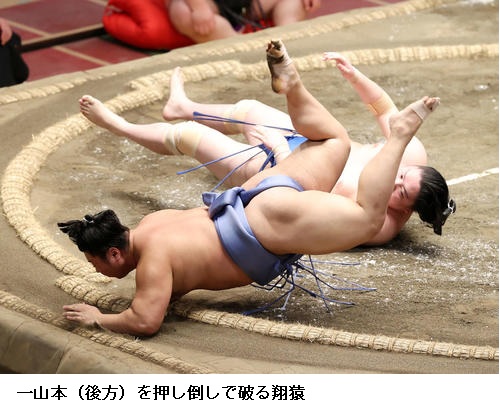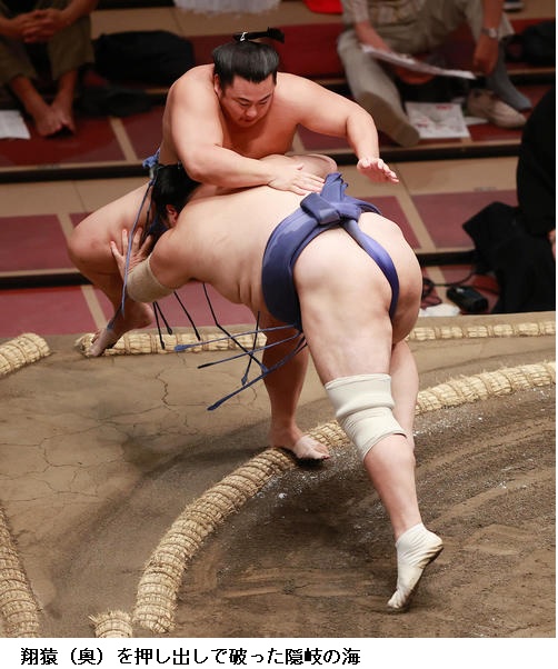 ▽隠岐の海に翔猿は隠岐の海が押し出しで7勝目。