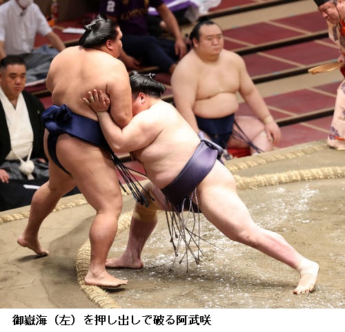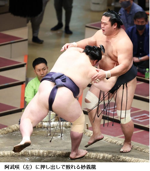 ▽妙義龍に阿武咲は阿武咲が押し出し。妙義龍は2敗に後退です。