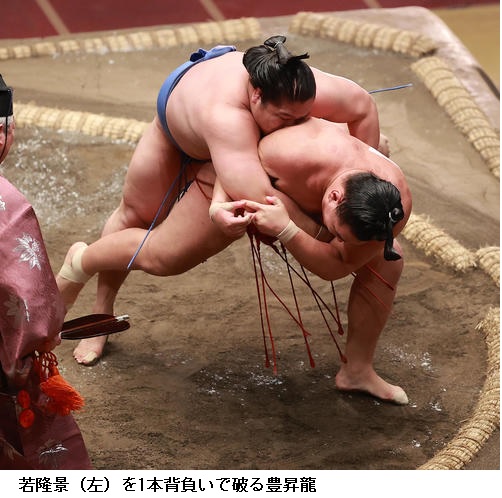 ▽豊昇龍に若隆景は、行司軍配差し違えで、豊昇龍が一本背負いで勝ちました。