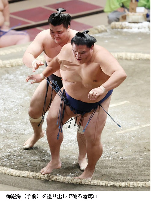 ▽関脇・御嶽海に霧馬山は霧馬山が送り出し。御嶽海は3敗目です。