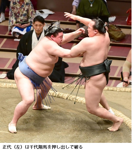 ▽大関・正代に千代翔馬は正代が押し出し。千代翔馬は負け越しました。