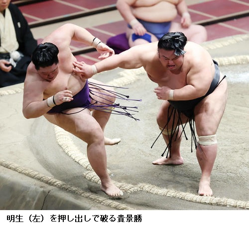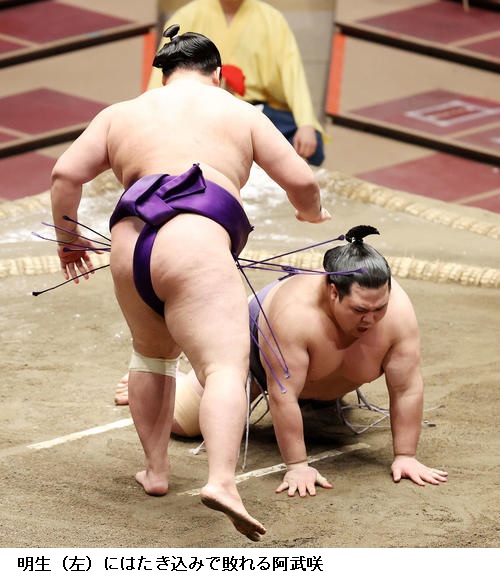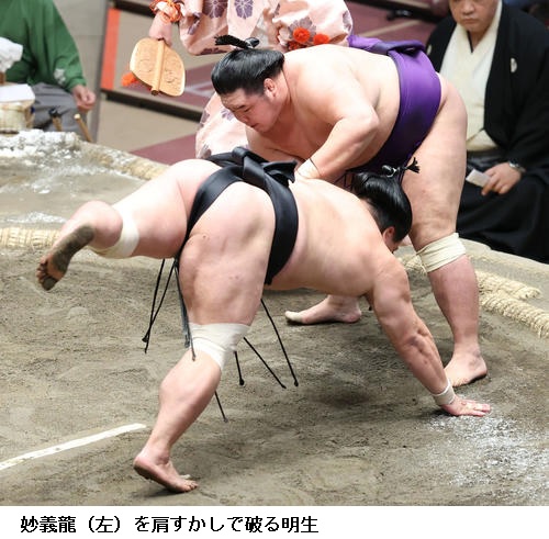 ▽妙義龍に関脇・明生は明生が肩透かし。明生は新関脇で勝ち越しです。