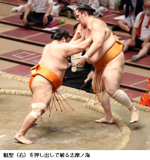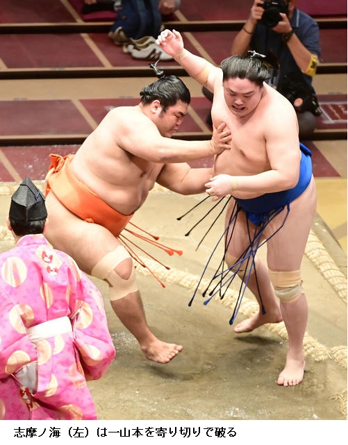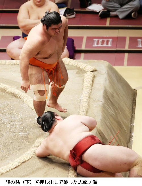 ▽志摩ノ海に隆の勝は志摩ノ海が押し出しで勝ち越しました。隆の勝は負け越しです。
