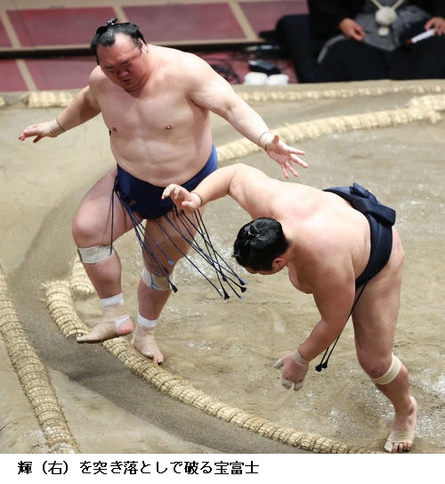 ▽宝富士に輝は宝富士が突き落とし。輝は負け越しです。