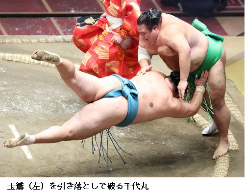 ▽千代丸に玉鷲は千代丸が引き落としで勝ち越しました。