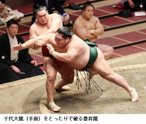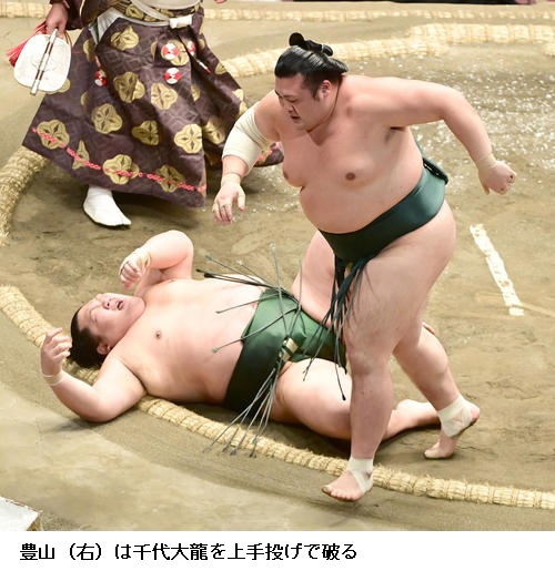 ▽千代大龍に豊山は豊山が上手投げで勝ち越しました。千代大龍は負け越しです。