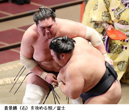 ▽大栄翔に横綱・照ノ富士は大栄翔が寄り切り。照ノ富士は今場所初黒星を喫し初めての金星を与えました。