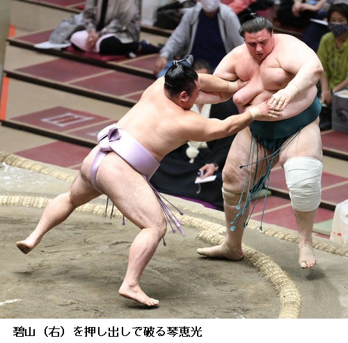 ▽碧山に琴恵光は琴恵光が押し出しで勝ち越し。碧山は負け越しです。