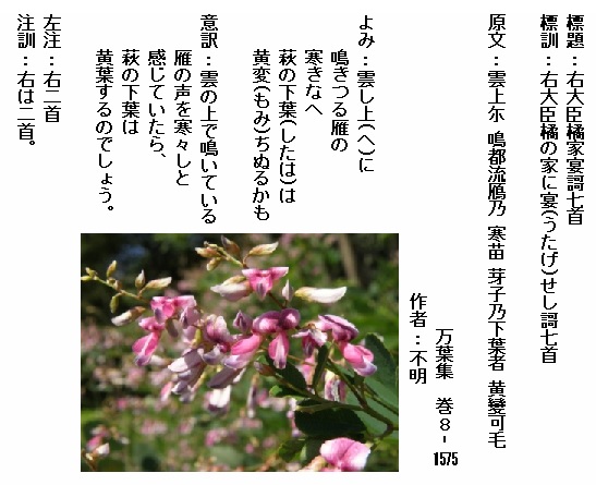 巻8-1575:雲の上に鳴きつる雁の寒きなへ萩の下葉はもみちぬるかも