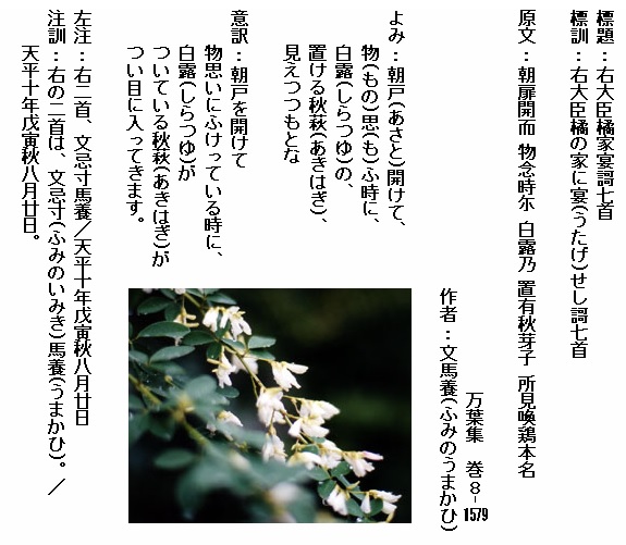 巻8-1579:朝戸開けて物思ふ時に白露の置ける秋萩見えつつもとな