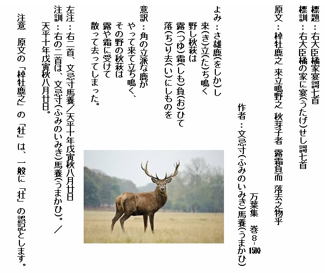 巻8-1580:さを鹿の来立ち鳴く野の秋萩は露霜負ひて散りにしものを