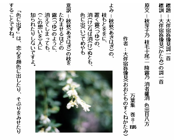 巻8-1595:秋萩の枝もとををに置く露の消なば消ぬとも色に出でめやも