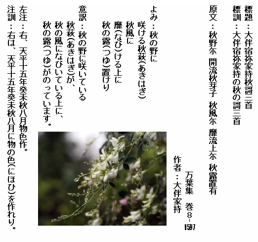 巻8-1597:秋の野に咲ける秋萩秋風に靡ける上に秋の露置けり
