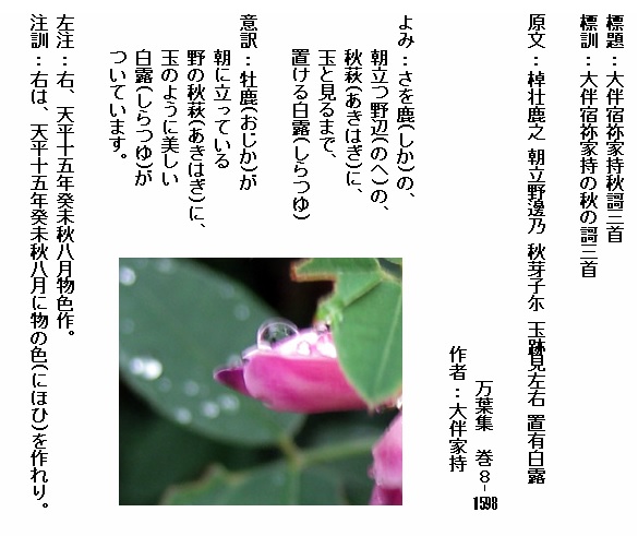 巻8-1598:さを鹿の朝立つ野辺の秋萩に玉と見るまで置ける白露