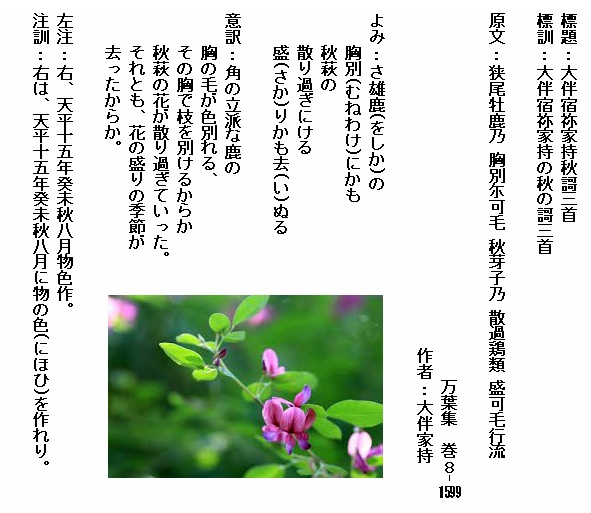 巻8-1599:さを鹿の胸別けにかも秋萩の散り過ぎにける盛りかも去ぬる
