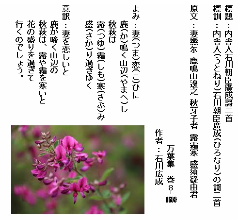 巻8-1600:妻恋ひに鹿鳴く山辺の秋萩は露霜寒み盛り過ぎゆく