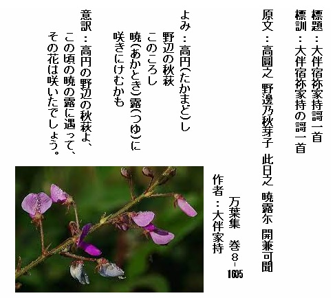 巻8-1605:高円の野辺の秋萩このころの暁露に咲きにけむかも