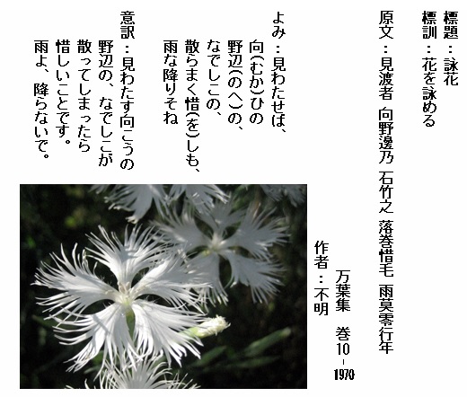 巻10-1970:見わたせば向ひの野辺のなでしこの散らまく惜しも雨な降りそね