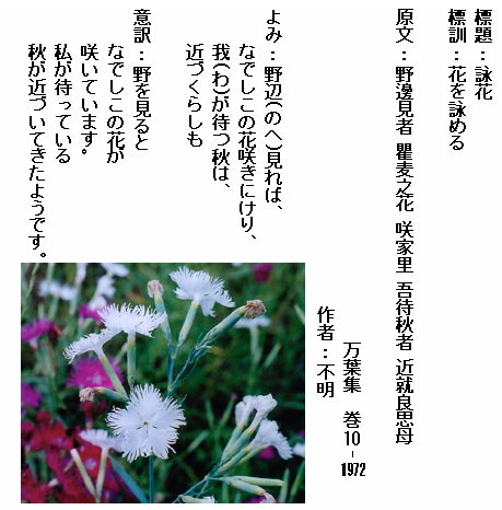 巻10-1972:野辺見ればなでしこの花咲きにけり我が待つ秋は近づくらしも