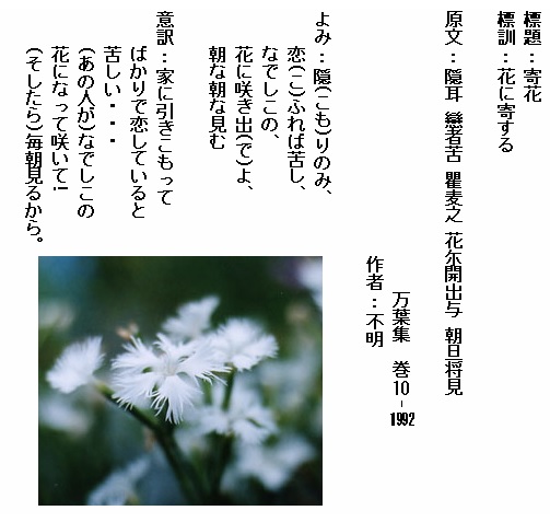 巻10-1992:隠りのみ恋ふれば苦しなでしこの花に咲き出よ朝な朝な見む