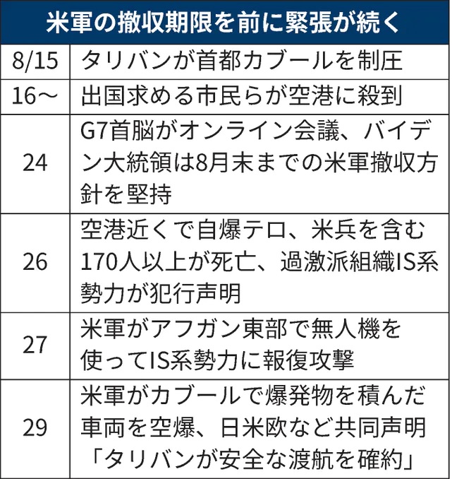 バイデン氏は4月、約2500人のアフガン駐留部隊を撤収させると表明した。部隊を5800人規模に増やし、米国人に加えてアフガン戦争で米国に協力したアフガン人の国外退避を8月末まで進めると説明してきた。欧州や日本も自国民らを退避させた。